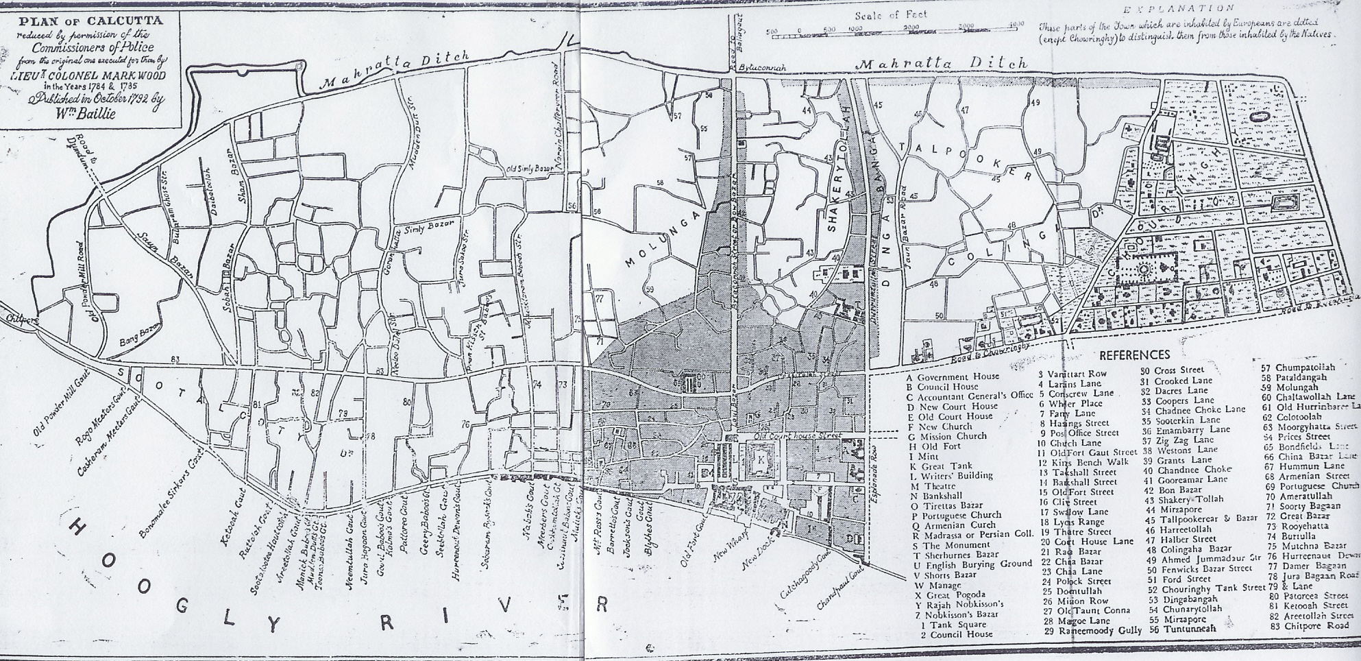 Plan of Calcutta; reduced by permission of the Commissioners of Police from the original one executed for them by Lieu Colonel Mark Wood in the years 1784 & 1785.. The parts of the Town, which are inhabited by Europeans are dotted (except Chowringhy) to distinguish them from those inhabited by the Natives