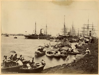 Calcutta river view, with sailing ships, steam ships, and boats in 1880s
