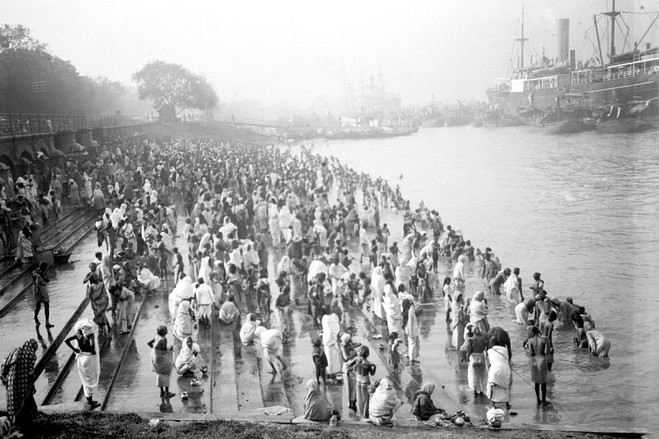 This is a view of a crowded riverside with bathers at Chandpal Ghat in Calcutta, the main landing site for visitors to the city along the Hooghly River. Ships arriving at Chandpal Ghat, while crowds gather by the docks. It is an old ghat on Hooghly. Existence of Chandpal Ghat as the southernmost Ghat on Hooghly is easily discernable in the ‘Plan of Fort William and part of the city of Calcutta’ surveyed in 1753.