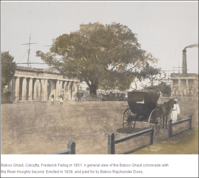 A general view of the Baboo Ghaut colonnade with the River Hooghly beyond. Erected in 1830. Also known as Rani Rashmoni Ghat. The ghat was founded by Rani Rashmoni in memory of her husband. The Baboo Ghaut stands near a main bathing place in Calcutta. The Steam Engine, which pumped water from the River Hooghly to clean the city streets, may be seen on the extreme right of the photograph, with shipping on the river in the background. The tall colonial structure, which is the landing berth of the ghat, is a fine Doric style pavilion with pillars. The marble tablet at the entrance quotes a Governor General lauding the public private collaboration 200 years back. Partially hidden by paint, it reads ‘with a view to encourage the direction of private munificence to works of public utility has been pleased to determine that this ghaut constructed in the year 1830 at the expense of Baboo Raj Chunder Doss shall hereafter be called Baboo Raj Chunder Doss’s Ghaut’.