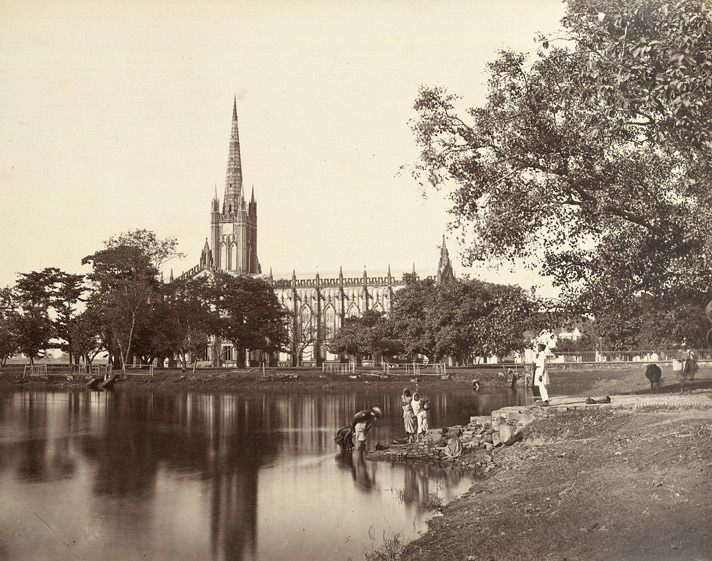 The view of the cathedral looking across the Birjee Tank (Birjee is the adjective of Braja. Brij or Brajbhoomi is considered to be the land of Lord Krishna) on the south-east corner of the Maidan. Dihi Birjee was bounded by the Burial Ground Road (now known as Park Street) on the north, Maratha Ditch (Lower Circular or Acharya Jagadish Chandra Bose Road) on the south, Race Course on the west and the unfinished portion of Maratha Ditch on the east.