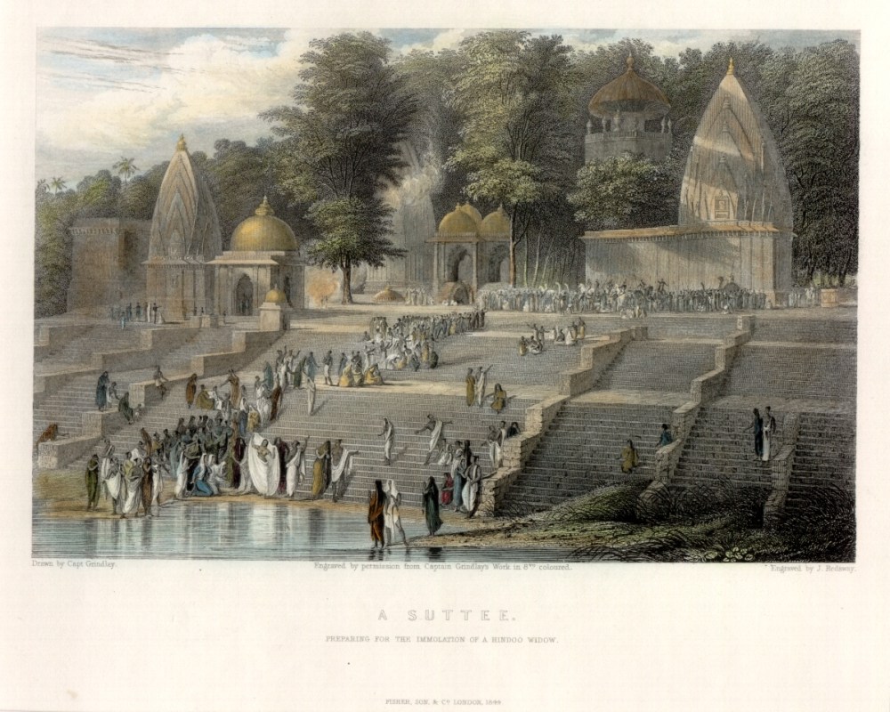 Preparing a Hindu widow for immolation as seen in this painting is a realistic depiction of the rite of Sati as was practiced in Hindu society. The practice was formally banned in 1798, but continued in the surrounding areas. From 1812 onwards, it was Raja Rammohun Roy who started his own campaign against Sati. His petition against Sati also took place in 1829. The practice finally was banned by The Bengal Sati Regulation of 1829 – a legal act promulgated in British India under East India Company rule, by the then Governor-General Lord William Bentinck. This made the practice of the immolation of a Hindu widow on the funeral pyre of her deceased husband—illegal in all jurisdictions of British India and subject to prosecution.