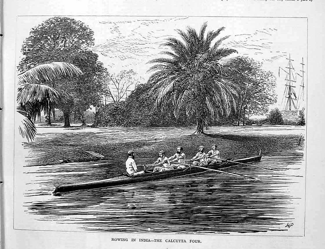 The pen & ink drawing,” Rowing in India -The Calcutta Four” was published in Illustrated Sports and Dramatic News, April 21, 1877.