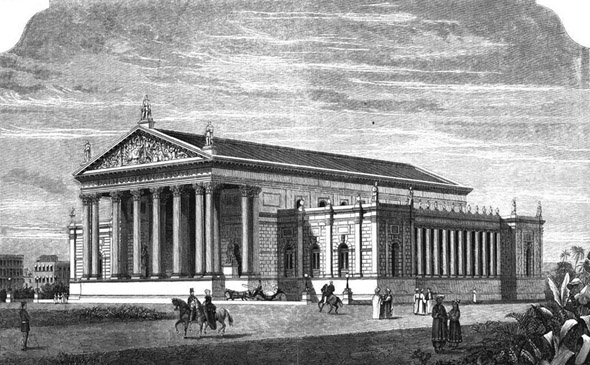 The large hall is to be used as a concert and public-meeting room, and will accommodate 1,000 persons seated. It is also to be appropriated to the reception of statues and other memorials of distinguished men. On either side of it are lecture-rooms, lavatories, and an extensive library. The design, externally, may be described as a Corinthian prostyle temple, octastylos; with a lower building, Ionic, on each side. The two outer columns on each side in the portico are close together, and the tympanum is filled with sculpture. Three statues take the place of acroteria on the pediment. The great hall has single Corinthian columns with antae projecting from the wall, on each side at intervals, and a vaulted ceiling, panelled, with lunettes above the entablature of the order. A recces at one end will receive an organ.”