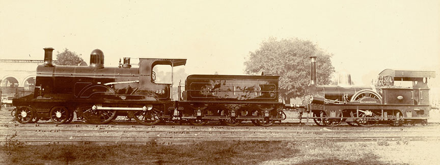 The above photograph of first locomotive, christened “Multum in Parvo” (Latin, “much in little”), shown on the right and manufactured in England, which was used by the East Indian Railway Company in 1854 on its first line from Howrah to Hooghly, a distance of 24 miles. The locomotive on the left is the latest model of 1897, the year this picture was taken in the Jamalpur Railway Workshop, Eastern India. (Image source: Elgin Collection. British Library)
