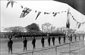 Military group lined up on the riverside, Kolkata, for the arrival or departure of the British royal visit.