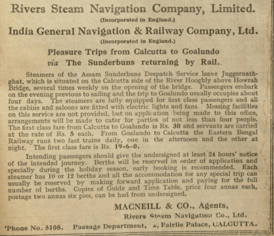 To my mind, for those answers it is critical for us to recognize a river ghat as a typical public facility in Indian context, mostly set up out of philanthropic zeal, or pious wish. Primarily it consists of a flight of steps to river edge to enable people to reach Holy River for performing rituals, bathing or ferrying. Besides that, optionally, ghat provides pavilion to benefit the bathers, and carries memories of the ghat-founder. Chhottelal pavilion is a rare exception to this convention, being erected on an ‘old existing ghat’ to commemorate someone unrelated to the original ghat. Perhaps, this is the reason why we find some vintage pictures of the Chhottelal pavilion bear names of Jaggernath Ghat, or Mullick Ghat, and the maps indicate no name of Chhottelal Ghat either. Moreover, we need to learn the exact position of the ferry ghat called ‘Juggernath Ghat’. Is it the same as ‘Basak’s Bathing Ghat or Jagannath Ghat of Barabazar? The only guidance to locate ‘Juggernath- ghat’ we find in Bradshaw 1935 where the shipping companies notify passengers to approach: