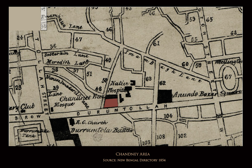 When Chandney Bazaar came into existence by 1832, there was no R C Church, no Tipu Mosque, but only the Dhurrumtollah Bazaar opposite Dhurrumtollah Tank stood on roadside since 1796 with Stibbert’s House behind. The oldest institution remained there was the Native Hospital built in 1793 near Chandney. In Talpooker, Pritaram erected his Jaunbazaar House in 1808. “In 1793-94, all over the town there were no fewer than 1114 pucca houses; in 1821 it increased to 14,230” [Biswas] The new suburbs as southern extension of Town Calcutta grew faster with masonry houses built by Europeans and deshi well-to-dos as nucleus of new urban experience of ‘airy habitation’ .