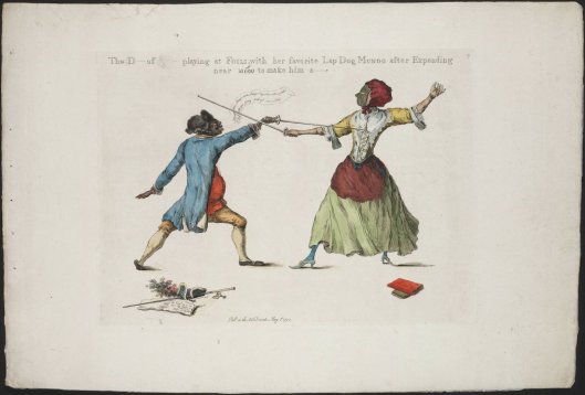 On May 1, 1773, they brought about a satirical picture depicting Soubise and the Duchess of Queensbury engaged in a fencing match, an engraving of Austin based on illustrations of fencing compiled by the Angelo fencing dynasty. Duchess Catherine and Angelo are thus implicated in the most disgraceful public attack on Soubise. As researchers think, it would be a mistake to read the cartoon’s use of fencing as merely allegorical or to assume that the duchess is the cartoon’s only target. In fact, the cartoon also implicates Dominico Angelo. Besides William Austin’s engraving, there have been most notably, A Mungo Macaroni (published September 10, 1772), part of a famous 1771-73 satirical series of engravings depicting fashionable young men, published by Matthew and Mary Darly.