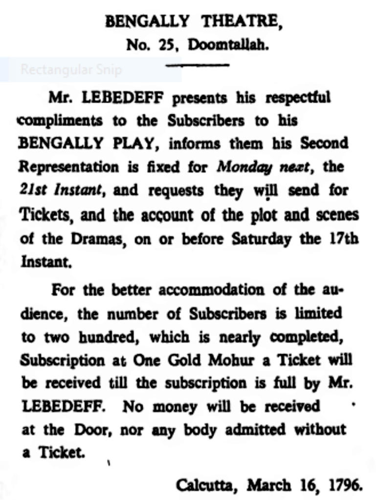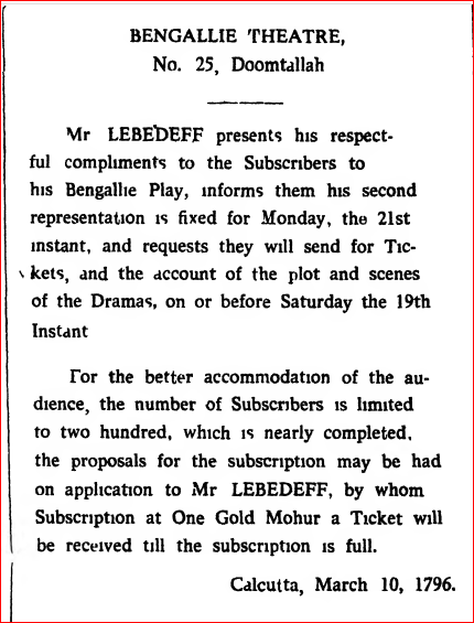 Indians in 1795-1796 were not welcome in Town Calcutta barring a few opulent native bigwigs, such as Omichand and Nabakissen. It is difficult to understand why Lebedeff, ignoring the racial adversity of the Britishers in India, had approached Calcutta Theatre, where none but the Anglo-Europeans were eligible to visit.