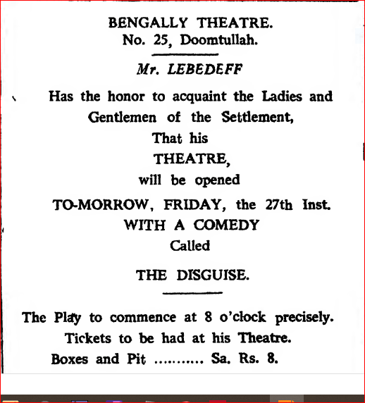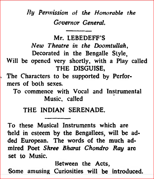 For the first time in India, a playhouse in the European style, with a stage and painted scenes with Bengali motifs and everything was established, and performed ‘one of the two English comedies, The Disguise, which Lebedev had got translated from English into Bengali for this purpose, with the help of Bengali actors and actresses. [Chatterji]