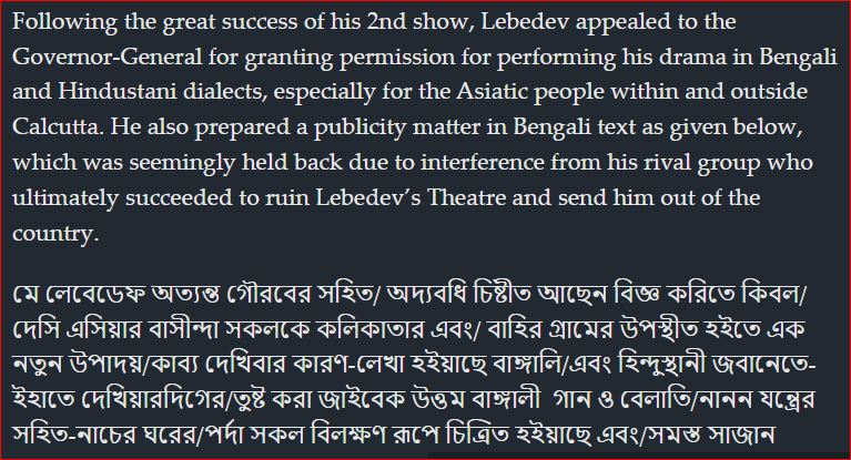 After performing the drama, The Disguise, with success for two nights, Lebedev recovered only half of my entire expenses. This was again spent with the hope to recover the entire expenses with profit. He made a request to the same Governor-General for permission to present the comedy in Bengali and English languages, so that it may be more pleasing to the public and better for learning the languages. Overwhelmed with new inspiration and new ideas to take his drama to the larger Bengal lying beyond the city of Calcutta Lebedev prepared the text to this effect in the Bengali language for a newspaper insertion: