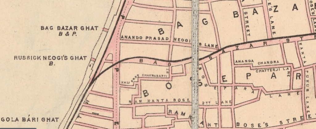 In those days of the National Theatre, the site of Russick Krishna Neogy Ghat stood next to the existing Annapurna Ghat beyond Nawab Bazar huts and shops a little further from Doorgacharan Mookerjee’s Bathing Ghat, Bagbazar Bathing Ghat, and the old Eastern Bengal Railway Co.’s Depot. The Ghat was approachable from Lower Chitpore Road through a cluster of shops between nos.216 and 217, near Bagh Bazar General Post Office. [Bengal]