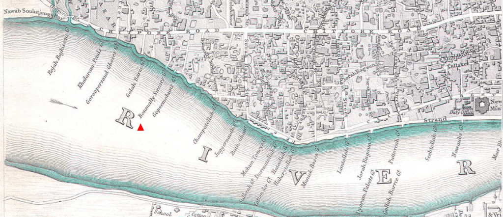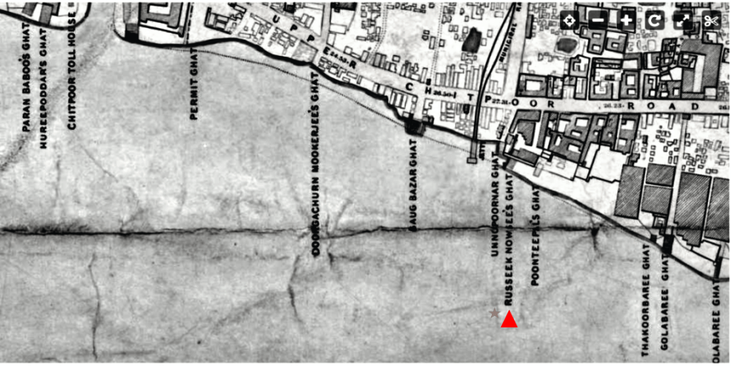 The next important Calcutta map produced by the Actual Survey of 1847-49 displaced Bonomalee Sirkar’s Ghat and introduced Russick Krishna Neogy Ghat.